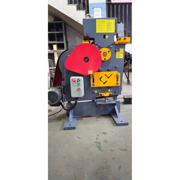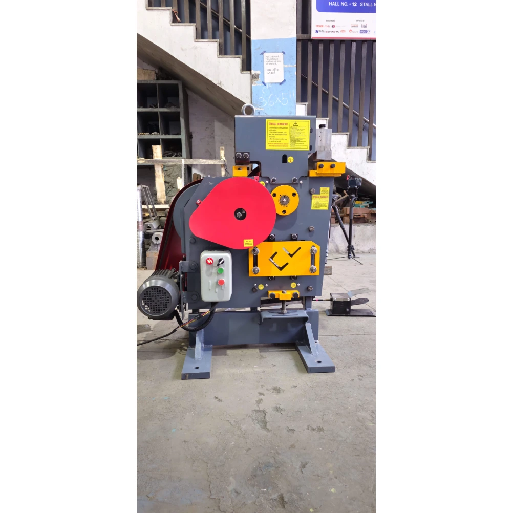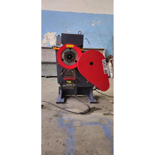 A:- The QA-32 8B is a versatile hydraulic iron worker machine designed for multiple metalworking operations such as punching, shearing, notching, and bending. It is a compact and powerful machine ideal for fabrication workshops, steel plants, and maintenance units.